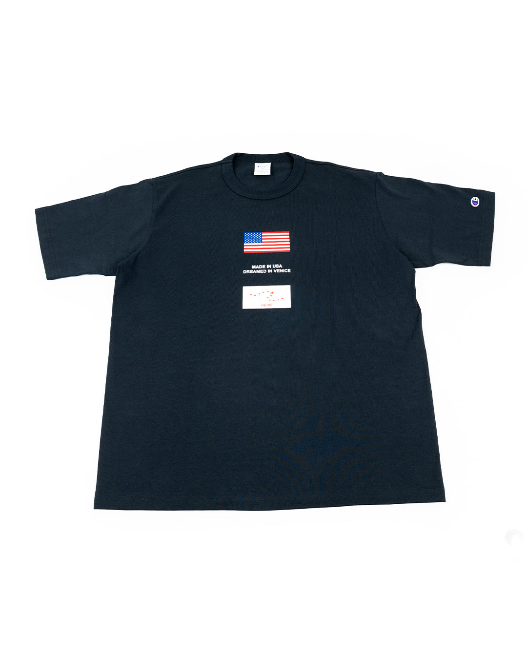 Stateside craft, Venetian vision. Champion's cotton classic carries the stars and stripes with Venice M'Art's signature touch. Daily essential, double heritage.