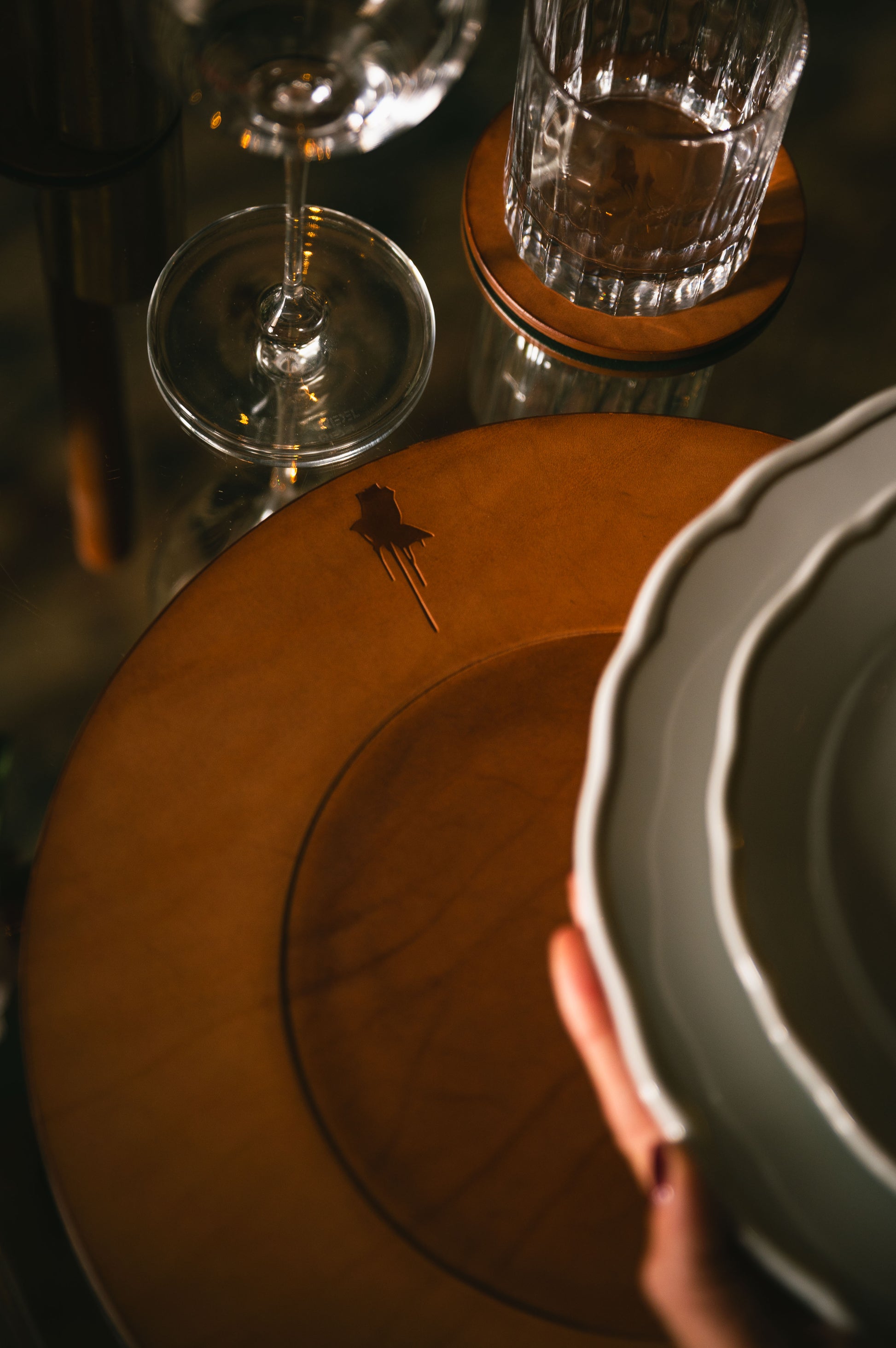 Artful foundation for elevated dining. Natural grain leather with The Erose emblem, bringing inspired elegance to intimate occasions.
